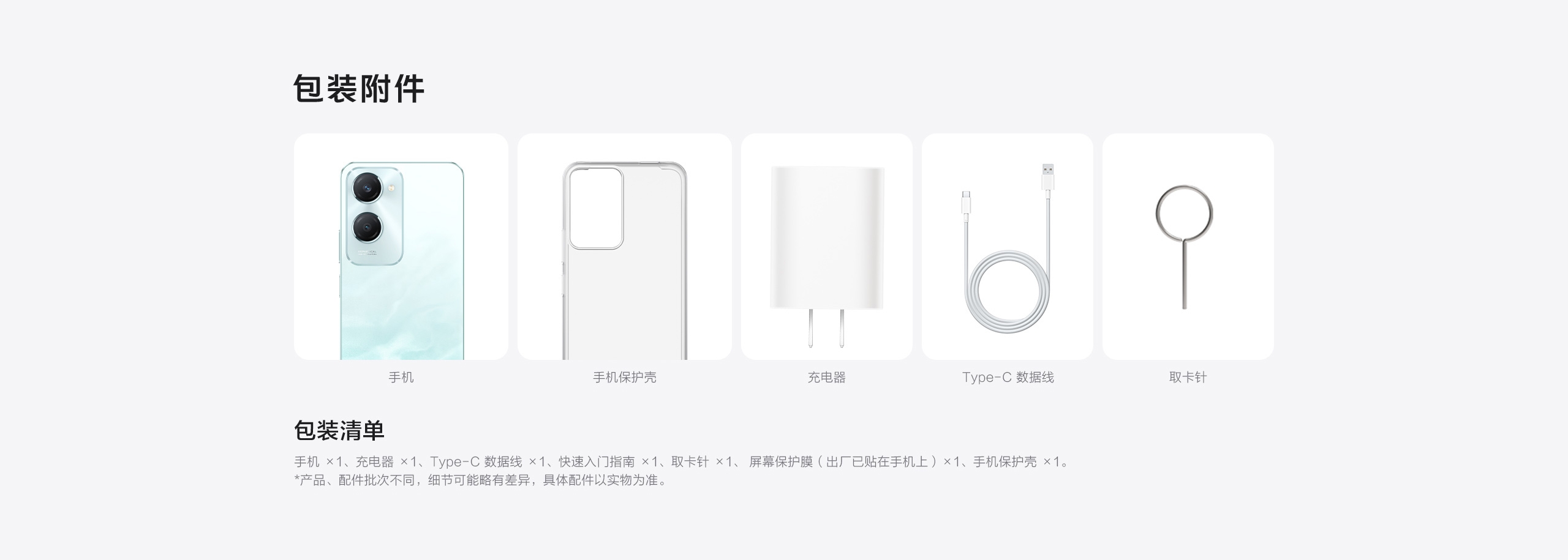 包裝清單:手機(jī) x1 充電頭 x1 Type-C數(shù)據(jù)線 x1 保護(hù)殼 x1 原裝膜(出廠已貼好) x1 取卡針 x1 快速入門指南 x1